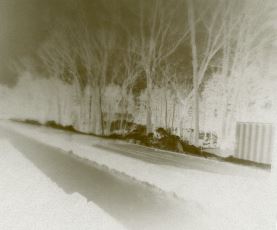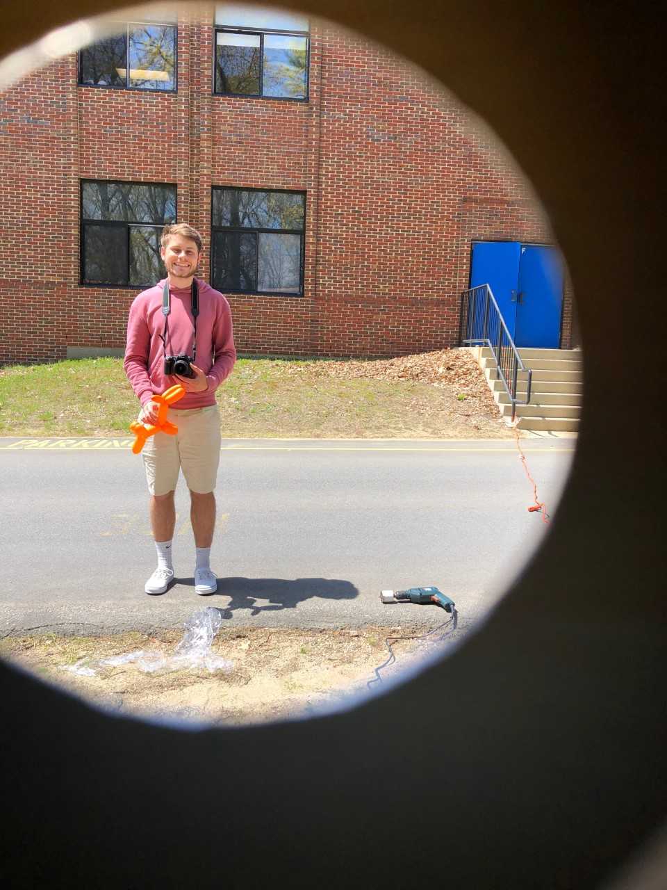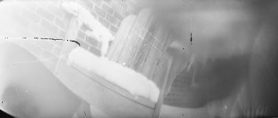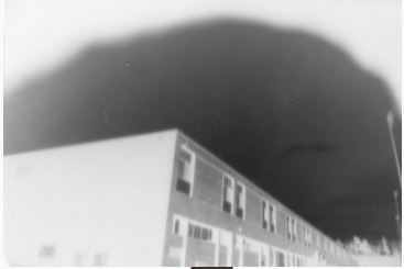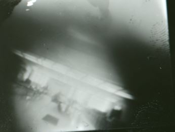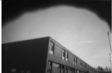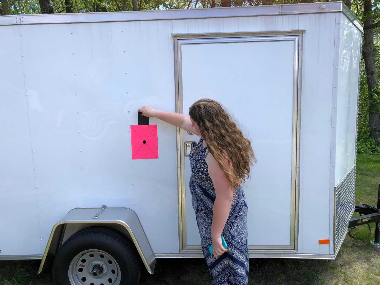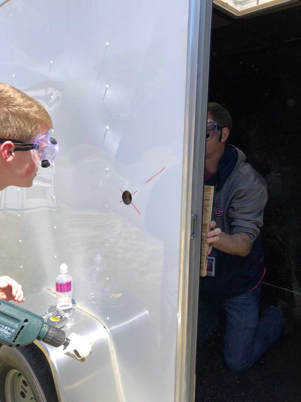Once the trailer was light safe, and the lighting had been installed, it was time to create an aperture hole. This hole will be larger than the aperture we are planning on using and will allow us to attach a lens board or a waterhouse stop to the trailer. It will also allow us to attach a simple shutter. A three inch in diameter hole saw was used to drill the aperture hole in the side of the trailer. With the aperture hole drilled, a simple cardstock waterhouse stop and shutter can be used to test the trailer.