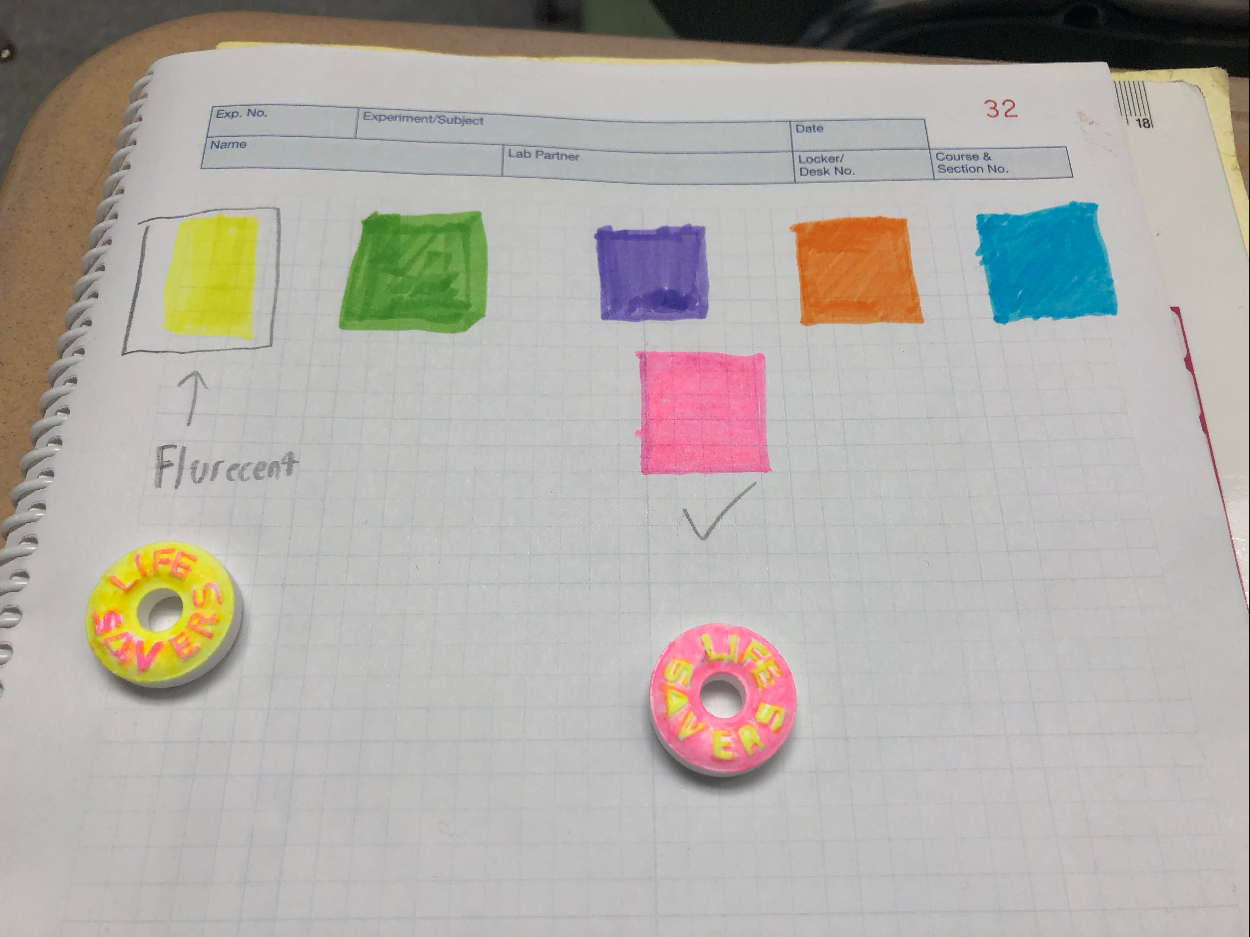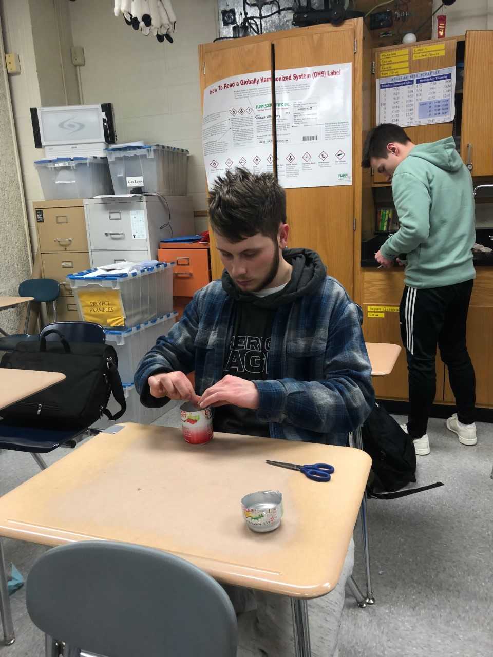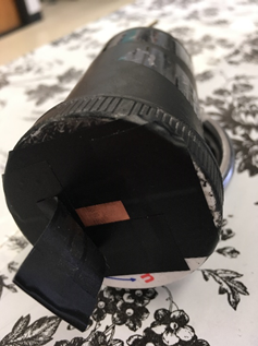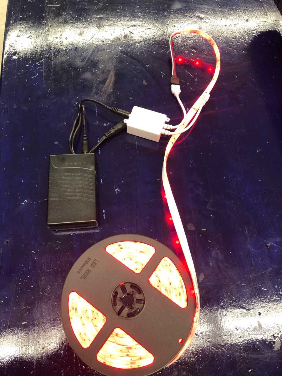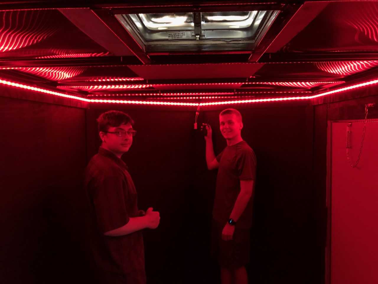 Once the interior of the trailer was light tight, the students needed to find a set of lights they could use so that paper could be developed without getting exposed. They also needed to find a power supply to run the lights, so they would not have to be run off of a car battery. The students decided to use LED strip lights. They determined that the light from the red LEDs did not fog the photographic paper by placing the LEDs a distance of two feet away from the paper and running the lights for 20 minutes. In addition to testing the lights they also had to test the battery packs. We purchased two 12 V, 3000 mAh lithium ion battery packs. The students calculated, based on the reported current draw of the LED strips, that one battery pack could power two ten foot LED strips for three hours. Testing indicated the battery pack could power the strips for two hours and thirty minutes which is more than a sufficient amount of time to develop photos. In addition, the strips can also be set to white light, to allow students to clean up under easy to see conditions. Once the testing was completed, the students mounted the lights in the trailer.