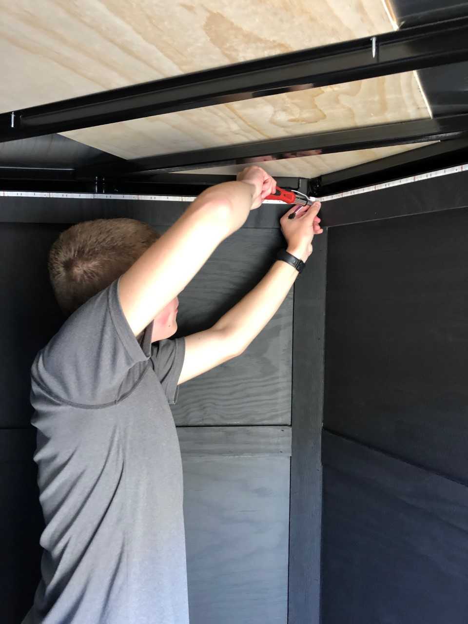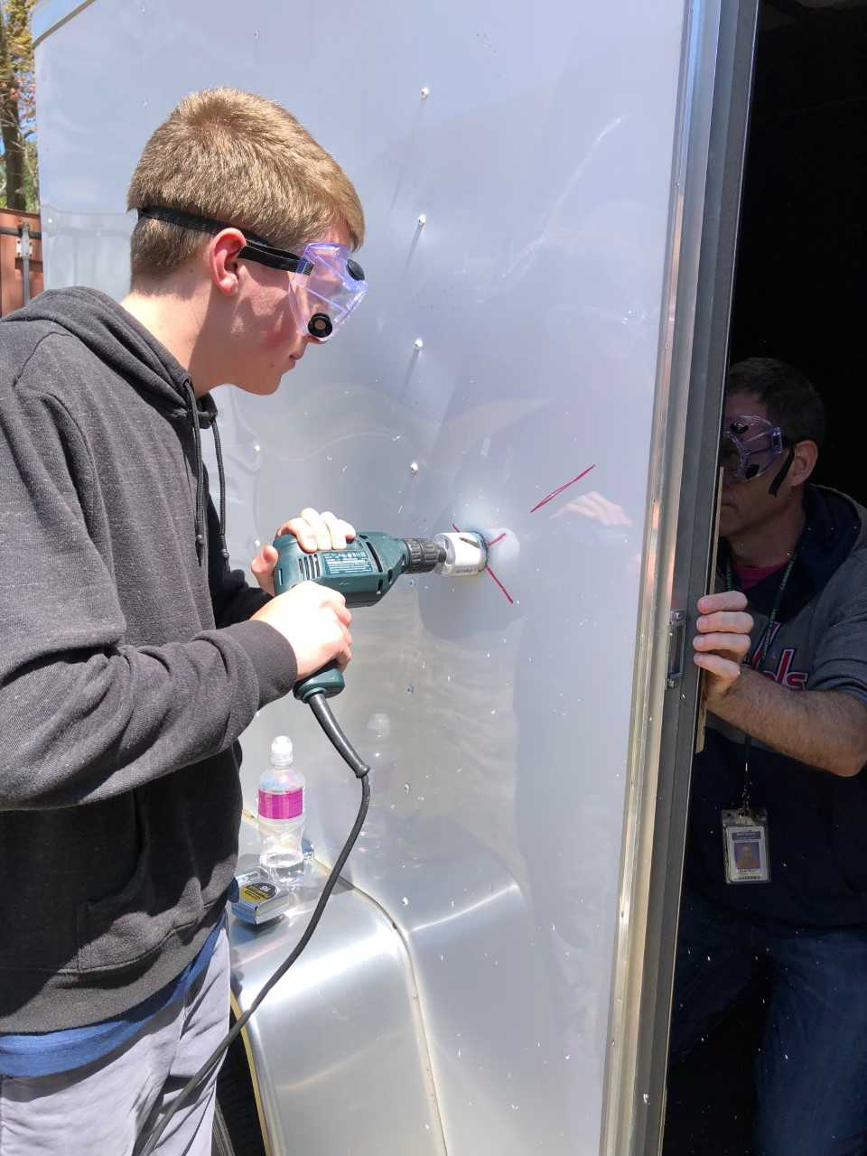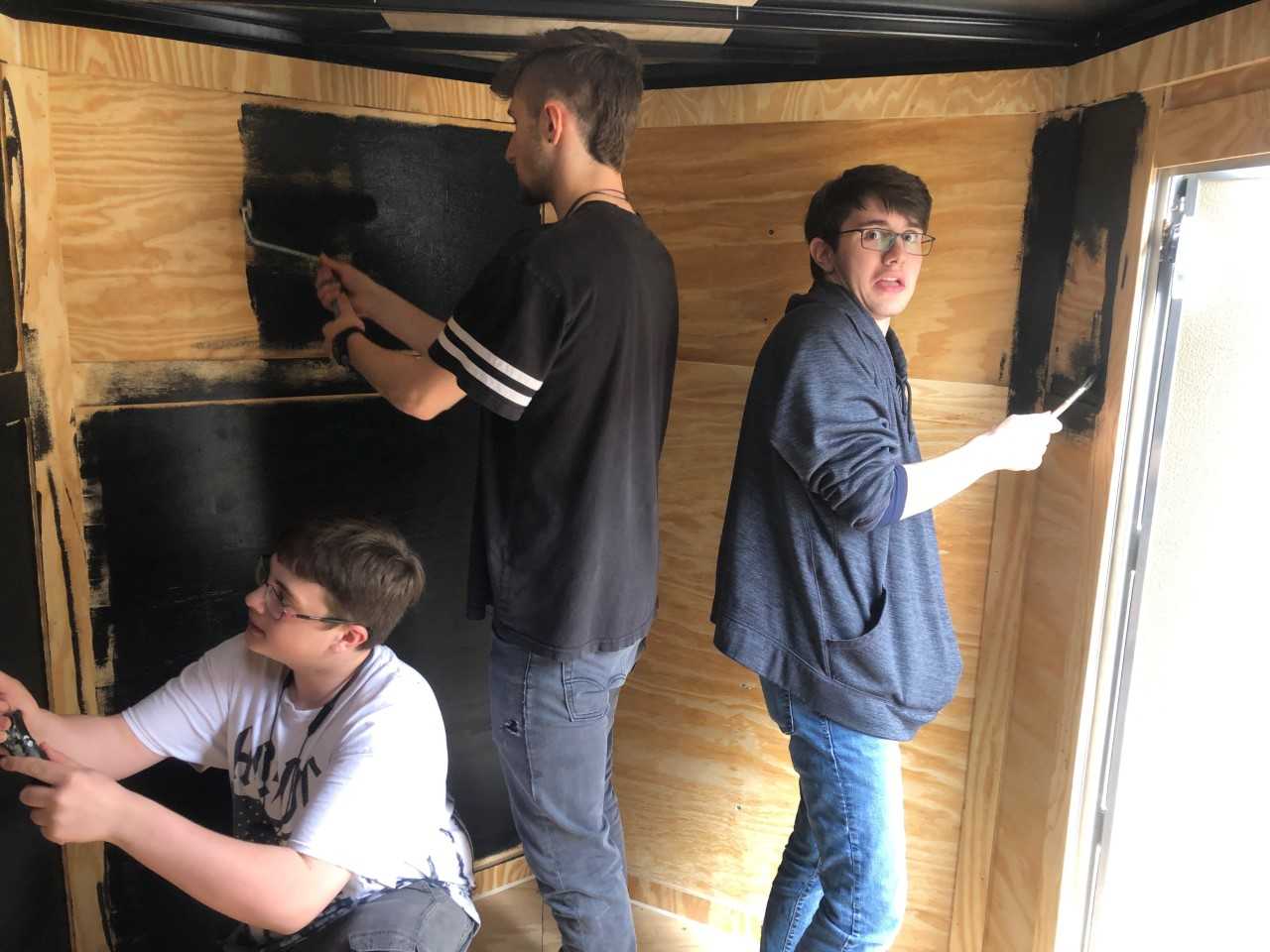 After researching a number of different options, including building our own trailer from the ground up, the students decided to purchase a trailer. Purchasing a trailer increases the safety (we don’t have to worry about it flying off of the frame when it is traveling) and allows the students to focus on the modifications needed to turn it into a camera. The trailer is 6 feet wide, 6 feet 3 inches tall, and 10 feet long, much larger than our original 5 foot, by 5 foot, by 8 foot design. Once the trailer was delivered, the first task was to paint the interior and caulk any light leaks with black silicone sealant.
